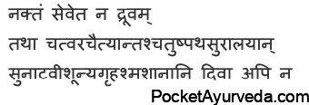 One must avoid the company of the following: wild animals, biting animals, and those with horns. The wicked, uncivilised and very talented individuals are also to be avoided. One should also avoid quarrel with individuals that are better-placed. At the time of sunset or sunrise, one should avoid taking eatables, copulation, sleeping and studying. One should also avoid the eatables given by the enemies, offered during sacrificial ceremony, eatables given by prostitutes and merchants. One should not produce sound with the body parts,