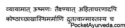 Exercise, temperature increases, and activities that are unwholesome or suitable can cause the movement of Koshta to Shakha due to Vata movement and Doshas accumulation, moving from the digestive tract into Shakha tissues such as Asthi bone or Marmas vital organs or sensitive points.