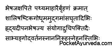 Mudga – green gram Mamsa – meat Ghrita – ghee. Medicines with Hrudya (cardiac tonic) and Deepana (digestive and carminative) properties can be combined with food and consumed.