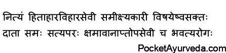 He, who indulges every day in healthy food and activities, who can distinguish the positive and negative aspects of all things and acts wisely, who does not cling excessively to objects of the mind, and who cultivates the habit of compassion, of seeing everyone as equal, of sincerity, of pardoning, and of being in the company of good people and only then, is free of any disease.